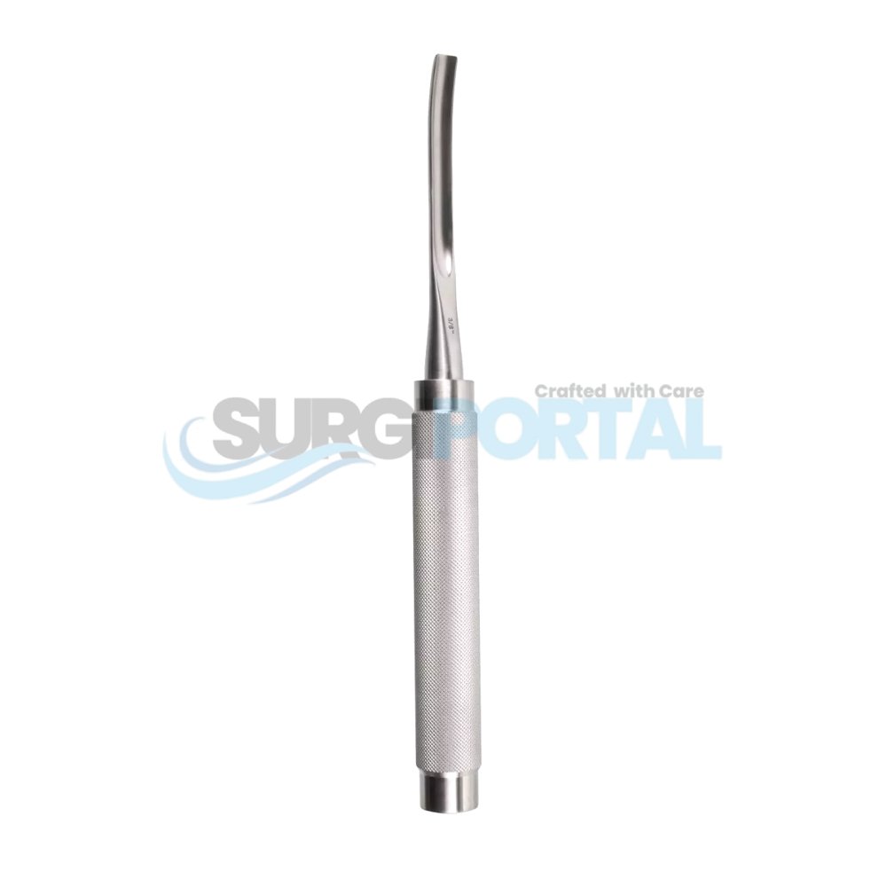 11″ Bone Gouge – Curved, 3/8″ Blade This 11-inch curved bone gouge with a 3/8-inch blade is ideal for clean and precise bone scooping and shaping. Its curved blade offers excellent anatomical access while maintaining balance and control during orthopedic procedures.