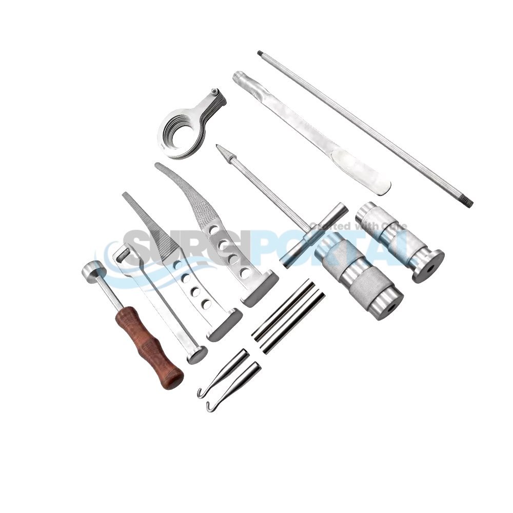 This Austine Moore Instrument Set Thompshon Hip Prosthesis Orthopedic is meant for implanting classic hemiarthroplasty hip stems. It includes broaches, rasps, canal reamers, femoral impactors, and implant inserter tools specifically sized for Thompson or Austin-Moore femoral heads. Precision engineering maintains prosthesis alignment during arthroplasty procedures.