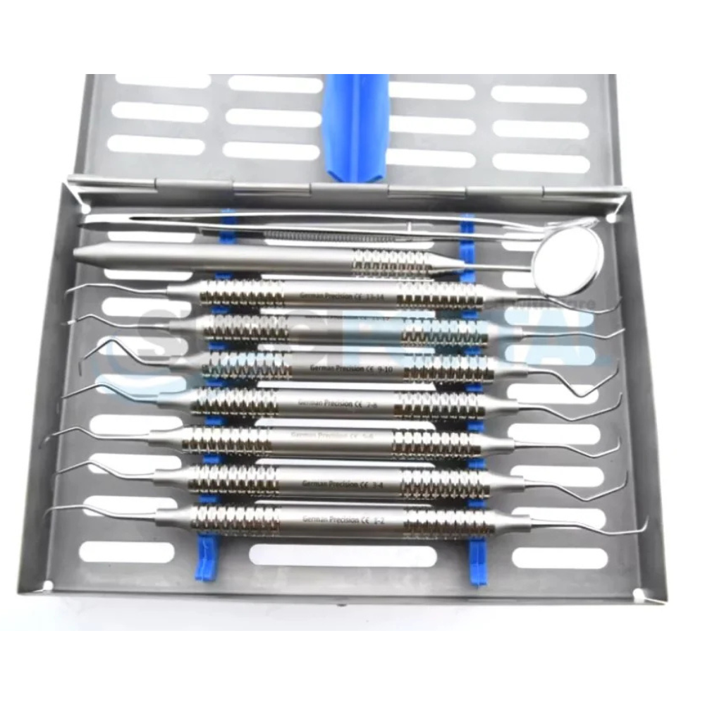 The Basic Dental Periodontal Gracey Curettes Explorer Prob Kit Of 10 Pieces combines the essential tools for periodontal scaling, probing, and diagnostic exploration. Whether for dental hygiene students or professionals, this versatile kit features finely crafted Gracey curettes and double-ended explorers, enabling thorough and accurate plaque and calculus removal in all quadrants of the mouth.