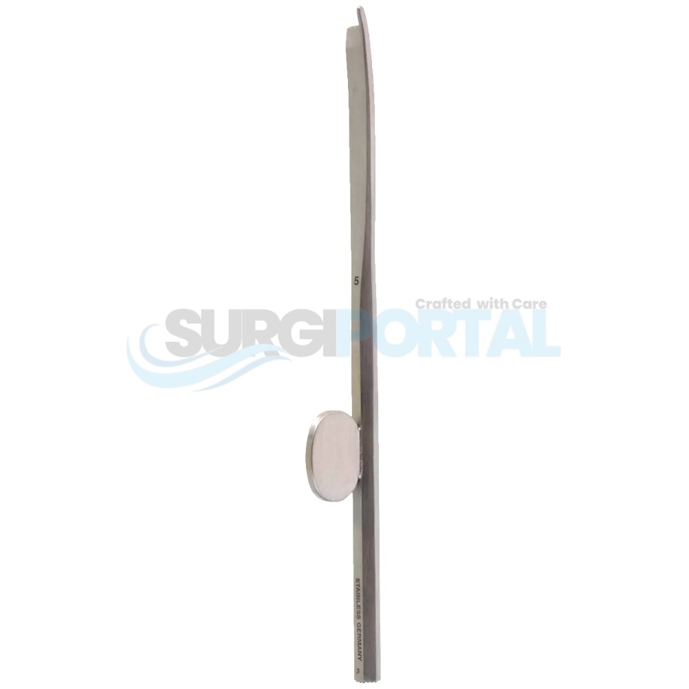 Cook Osteotome – 6 inch 1/4″, 5mm Cut Edge, Curved Right cut edge and curved right blade is a specialty tool designed for selective bone reshaping in facial and nasal procedures. The right-curved profile offers directional access to lateral nasal walls and orbital rims, facilitating ergonomic handling during complex reconstructions. Its precise curve helps guide controlled cuts without obstructing the surgeon’s line of sight.