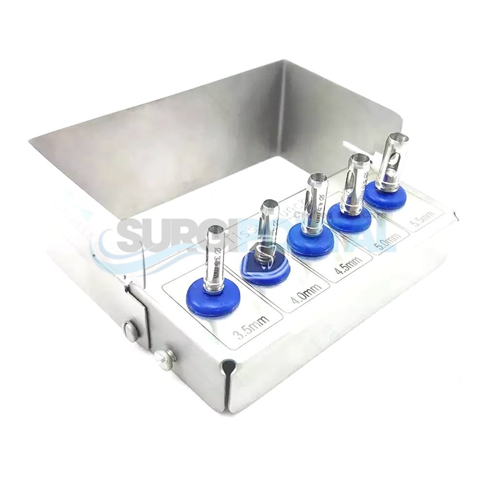 Dental Implant Tissue Punch Kit of 5 Pieces Surgical Tools Kit The Dental Implant Tissue Punch Kit is designed to provide clinicians with clean and precise access to the alveolar bone during implant placement without causing unnecessary trauma to surrounding soft tissue. The set includes five tissue punches of varying diameters, enabling users to select the appropriate size for each case. Crafted from premium surgical-grade stainless steel, these punches offer excellent sharpness, durability, and autoclavability. This kit is essential for flapless implant surgeries and soft-tissue preservation.