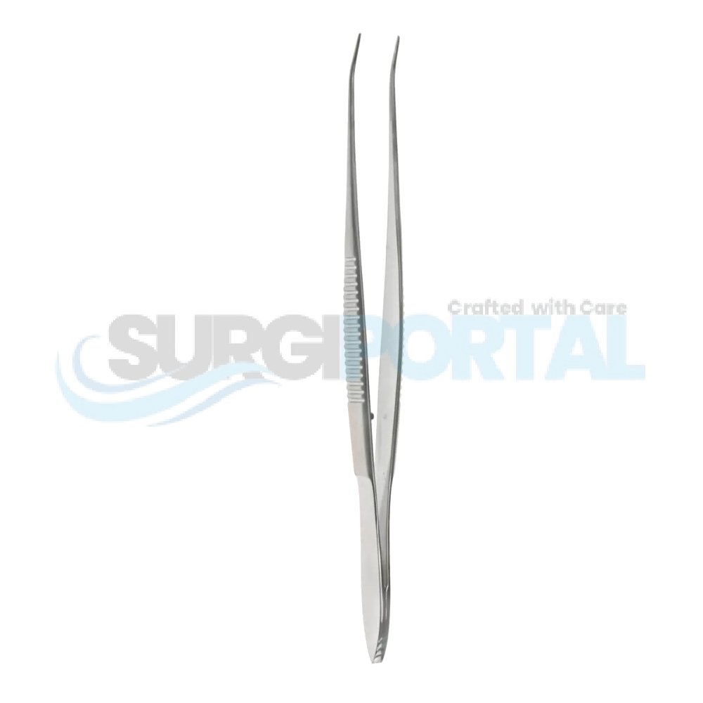 Dress Forceps – Serrated Delicate Tips, Light Curve are a precision ophthalmic instrument designed for highly controlled tissue handling during microsurgical procedures. Their finely crafted, gently curved tips allow surgeons to approach delicate ocular structures with minimal trauma while ensuring reliable grip on tissues or fine sutures. The serrated tip design enhances stability, preventing slippage, which is crucial in procedures where millimeter precision defines the surgical outcome. Constructed from surgical-grade stainless steel, these forceps ensure corrosion resistance, superior durability, and autoclave compatibility. Their lightweight and balanced structure makes them ideal for extended surgeries, providing the surgeon with enhanced comfort and reducing fatigue. These forceps are frequently used in corneal, cataract, and reconstructive eye surgeries where delicate yet secure tissue handling is essential.