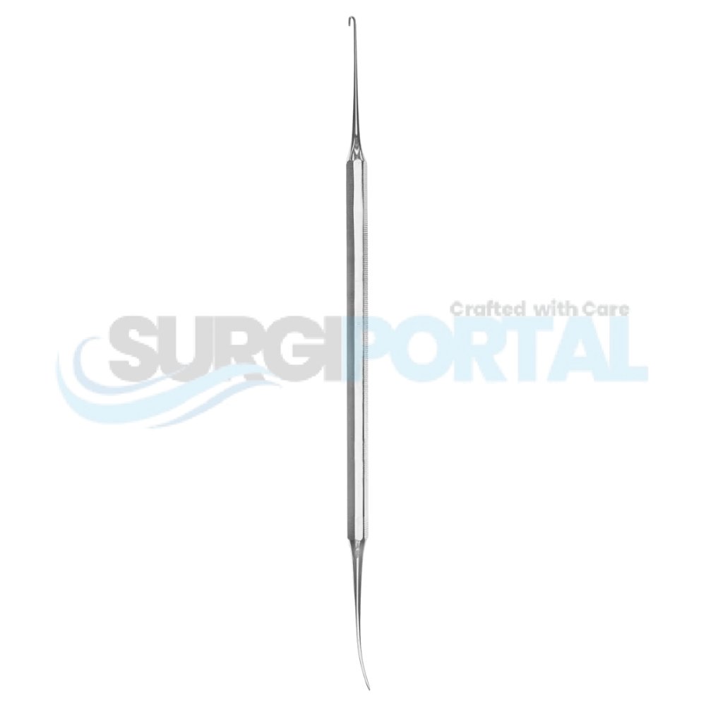 Hook Fork Dual Ended Surgical Instrument is a versatile, dual-ended surgical instrument featuring a sharp skin or tissue hook on one side and a delicate fork on the other. This design enables simultaneous retraction and manipulation of soft tissues during precise surgical procedures.