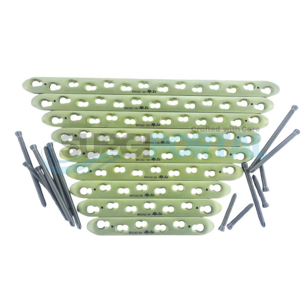 Locking 4.5 5mm Broad Plate compression plates ranging from 6 to 14 holes. Designed for treating femoral and tibial shaft fractures, the plates feature LCP combi-holes for locking and conventional screw placement. Titanium Grade 5 construction ensures light weight, excellent mechanical strength, and compatibility with imaging. The set also contains matching 5.0mm LCP screws for robust fixation across a range of surgical cases.