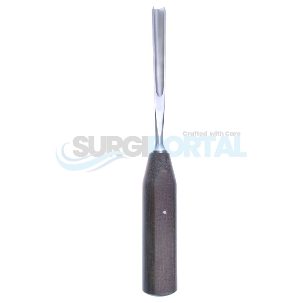 With a slim straight blade and ergonomic phenolic handle, this gouge offers precision and comfort for controlled bone work.
