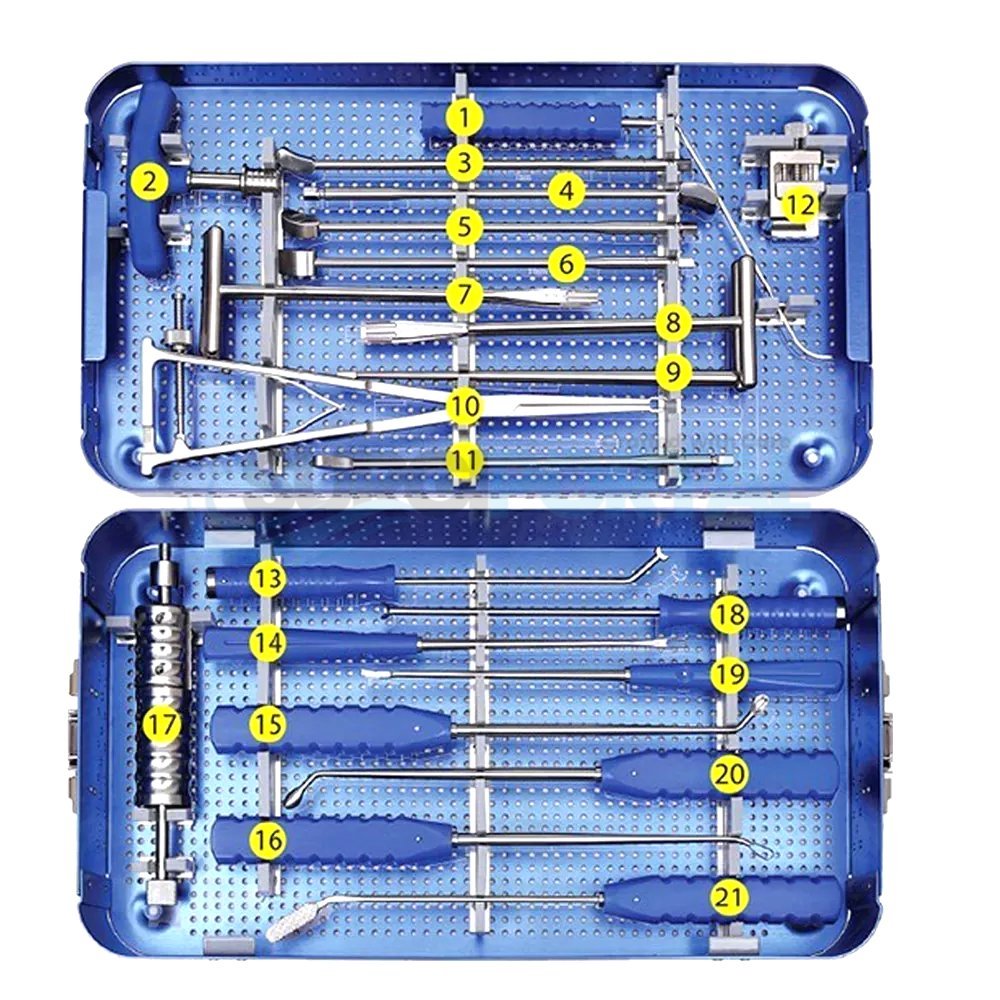 The TLIF PEEK Cage Instrument Set is a specialized spinal surgery kit engineered for precise placement of PEEK cages during transforaminal lumbar interbody fusion procedures. This comprehensive set includes instruments for disc space preparation, cage insertion, and alignment, ensuring stability and optimal fit. Crafted from high-grade surgical stainless steel and titanium where necessary, each tool is ergonomically designed for surgeon comfort during complex spinal operations.