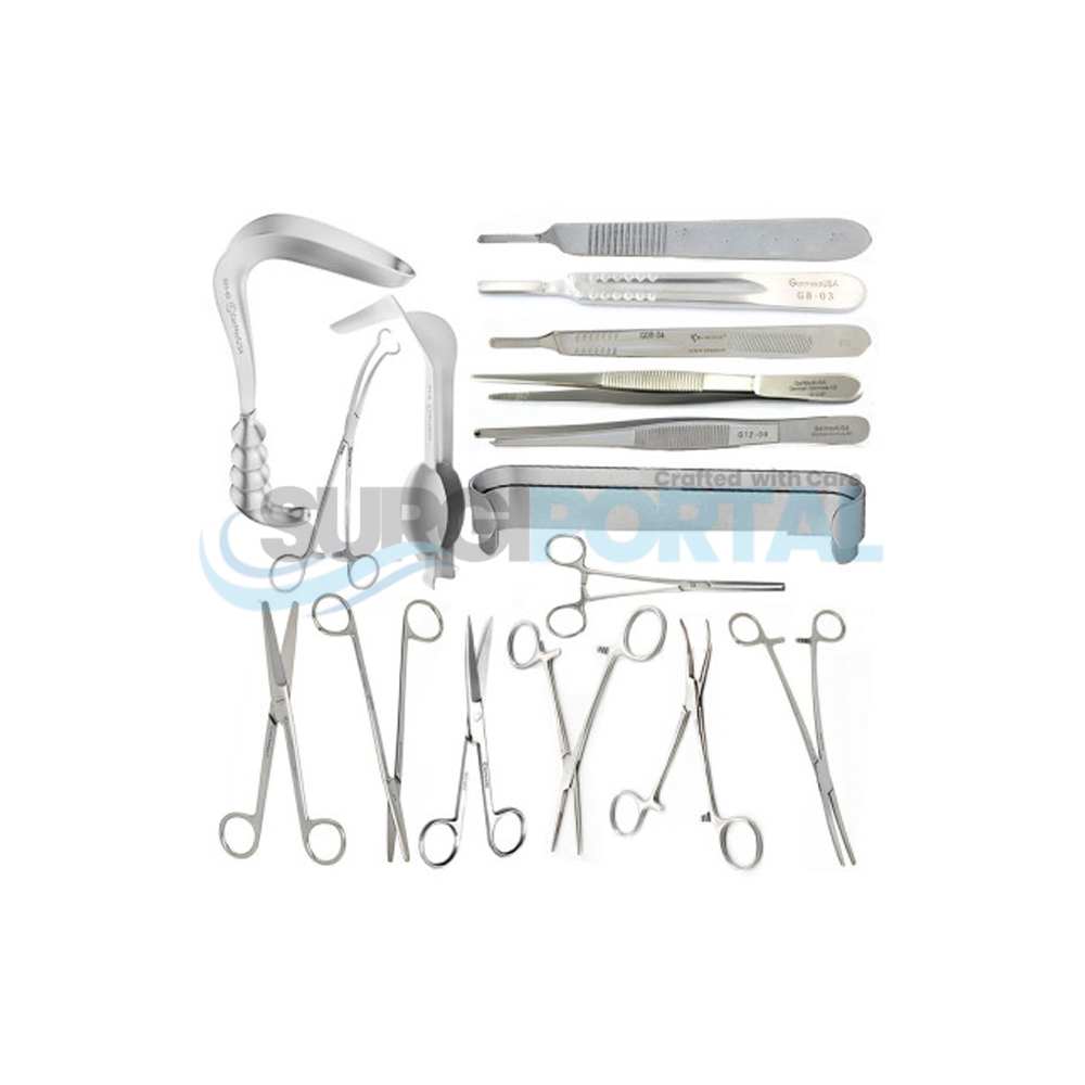 This set is manufactured using high-grade AISI 420 & 304 German stainless steel with instruments coated with Carb-N-Sert blades and jaws where required. Each tool is ergonomically designed for surgeon comfort, efficient tissue handling, and precise dissection. It includes vital components such as Heaney-Simon retractors, Graves speculum, Gemini-Mixter forceps, and various sizes of Allis and Babcock forceps—making it ideal for both hospital and ambulatory surgical settings.
