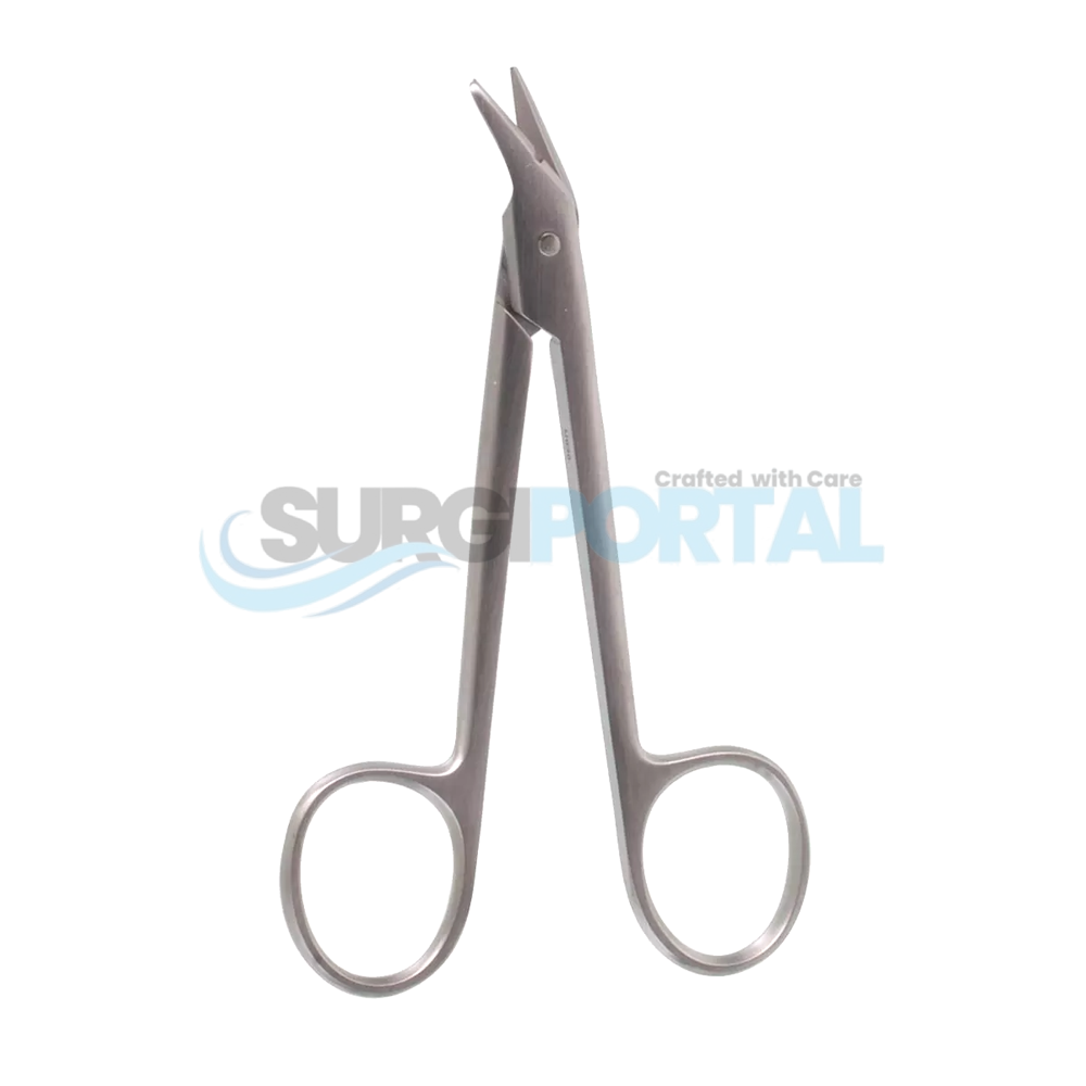 Wire Cutting Scissors Angled, Serrated, Notched Blades These specialized Wire Cutting Scissors feature angled, serrated, and notched blades—designed for high-efficiency cutting of tough surgical wire. The notch securely traps the wire while the serrated blade slices cleanly without slippage.